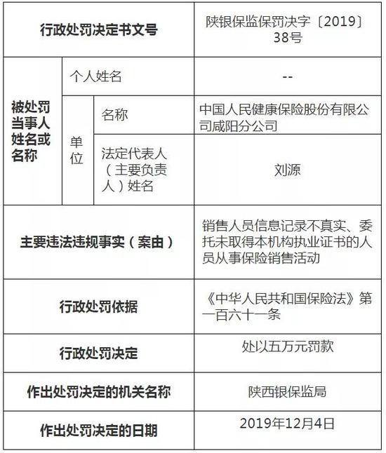除了前述因“保险条款、保险费率”相关问题被处罚的保险机构,中国人保健康还因销售人员信息记录不真实、委托未取得本机构执业证书的人员从事保险销售活动而被处罚5万元,责任人穆玉龙被警告并罚款1万元,作出处罚决定日期为12月4日。