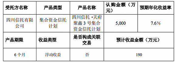 资料显示,四川信托·天府聚鑫3号集合资金信托计划为受托人根据委托人的指定,将信托合同项下的信托资金投资于银行存款、逆回购、货币市场基金、债券基金、交易所及银行间市场债券以及低风险的固定收益类产品(包括信托受益权、债权或债权收益权、附加回购的非上市公司股权收益权、固定收益类银行理财产品)等。