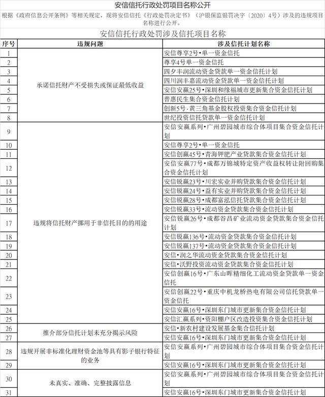 4月7日,安信信托针对处罚情况通过公告进行了披露,2016年7月至2018年4月,安信信托通过签订远期转让协议、出具流动性支持函等方式,违规承诺8笔信托财产不受损失或保证最低收益,金额共计33.3亿元。截至2019年7月末,上述协议或支持函均已到期,已造成严重的兑付风险。2016年至2019年,安信信托违规将3笔信托财产用于股东、8笔信托财产用于兑付其他信托项目、2笔信托财产用于置换固有贷款、4笔信托财产用于其他非信托目的用途,金额共计126.56亿元。截至2020年1月,上述项目基本已逾期或欠息。