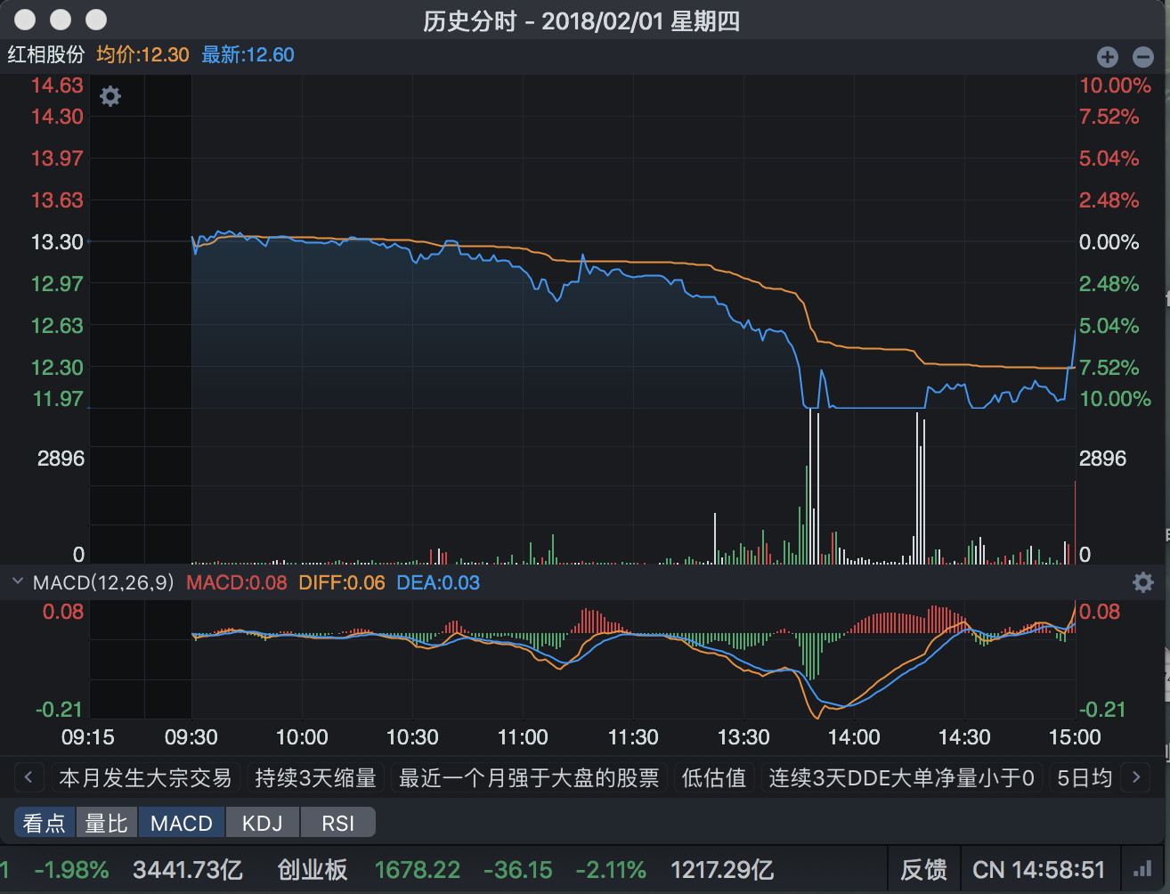 以红相股份(300427.SZ)为例,2018年2月1日13:47的跌停,以及之后的两次跌停的砸盘均来自于天津信托的平仓卖盘。券商交割单显示,在红相股份九笔11.97元跌停价格的委托卖单中,除一笔撤单外其余八笔均成交,累计卖出228万股。好在这三次砸盘的跌停板都在短时间内被买盘撬开,最终股价在买盘抢筹的推动下报收于12.6元,当日跌幅仅5.26%。