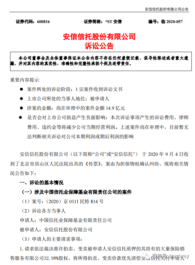 因此,信托保障基金公司将安信信托告上法庭,9月4日,安信信托收到了北京市房山区人民法院出具的《传票》,案由为担保物权确认纠纷。