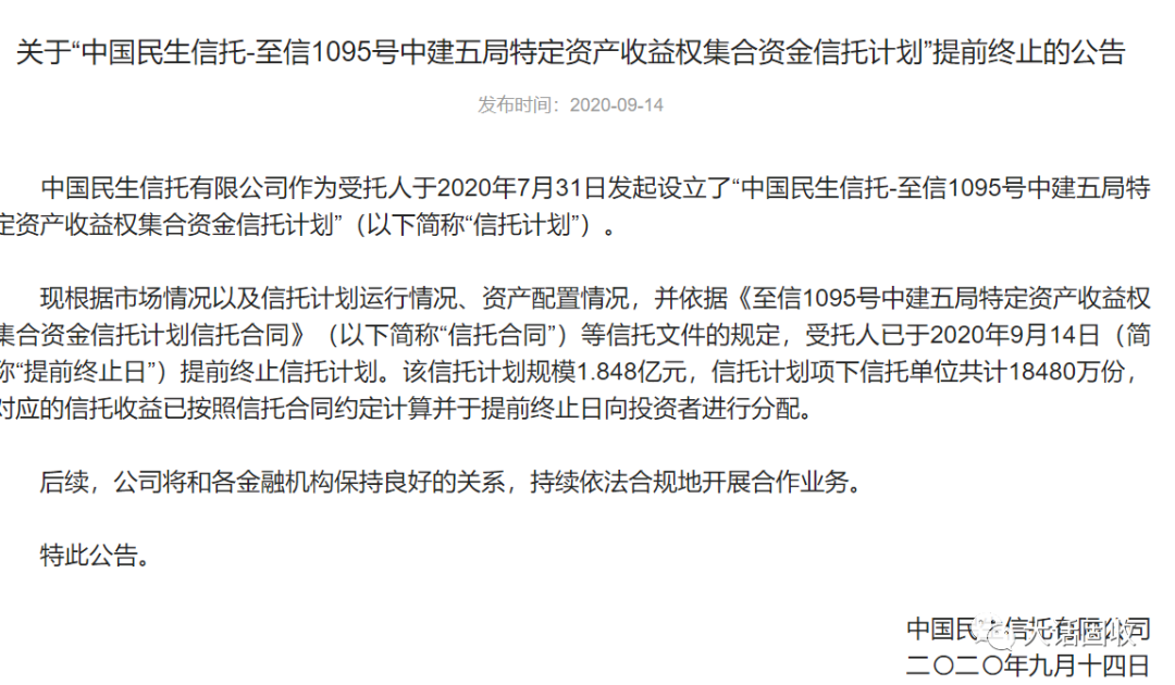 突然被CUE,民生信托也没有慌,上周五镇定公告项目提前结束,本周一就给了收益分配通知: