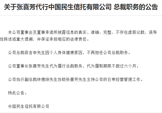 民生信托9月30日发了一则公告,公司总裁田吉申因个人身体健康原因辞任总裁一职,公司董事长张喜芳代为履行总裁职务,代为履职期限不超过六个月。