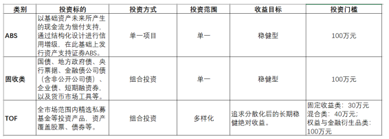 投资范围上,TOF可以覆盖股票、债券等多个资产类别,其他两类产品投资范围更为集中;收益来源上,TOF收益包括股票、债券等市场的系统性机会,以及所投资优质产品的超额收益。ABS来自被投项目的利息回报,固收类收益来自利息收入和息差收入;风险控制上。TOF采用分散投资方式,并根据市场环境变化调整组合。通过系统科学的标准体系筛选优质投资产品,也在一定程度降低了风险。其他两类产品更重视资产信用风险分析评估。
