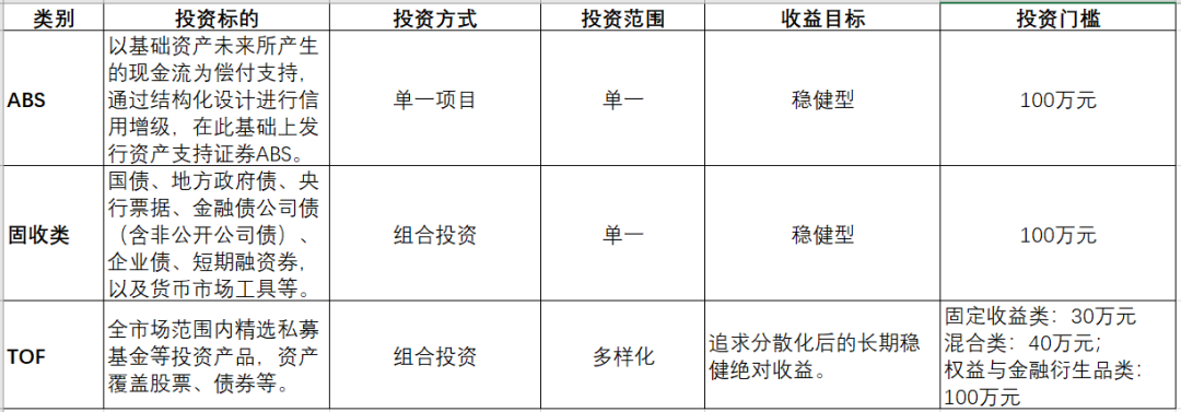 投资范围上,TOF可以覆盖股票、债券等多个资产类别,其他两类产品投资范围更为集中;收益来源上,TOF收益包括股票、债券等市场的系统性机会,以及所投资优质产品的超额收益。ABS来自被投项目的利息回报,固收类收益来自利息收入和息差收入;风险控制上。TOF采用分散投资方式,并根据市场环境变化调整组合。通过系统科学的标准体系筛选优质投资产品,也在一定程度降低了风险。其他两类产品更重视资产信用风险分析评估。