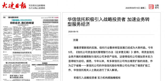 9月15日,华信信托官方微信公众号转载了大连日报2020-09-15A06版里关于华信信托的一篇报道。