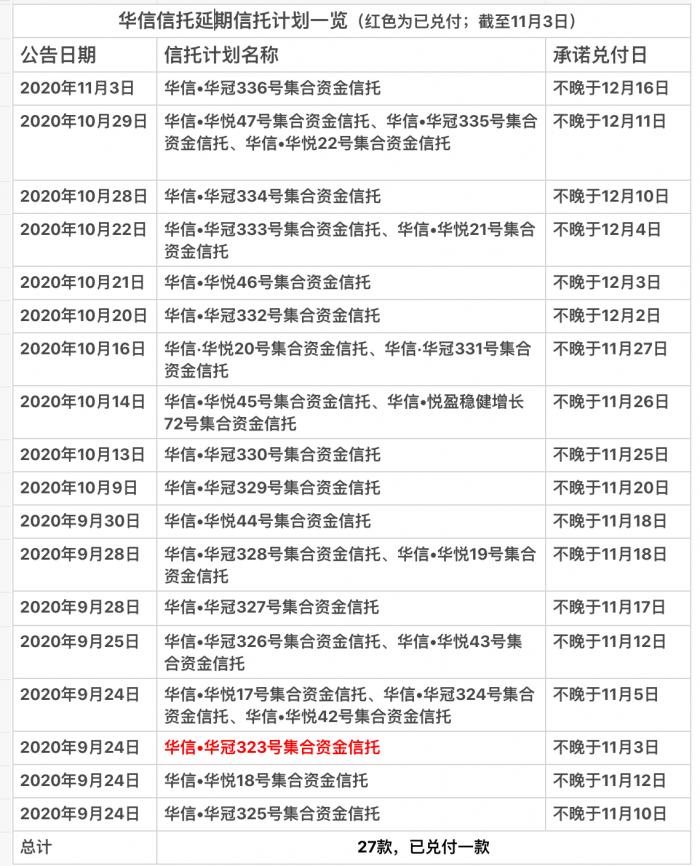 公布已兑付的当天,华信信托还公布了另外一款信托计划进入延期。截至11月3日,华信信托已公告了27款信托计划延期,其中一款已按约定兑付。