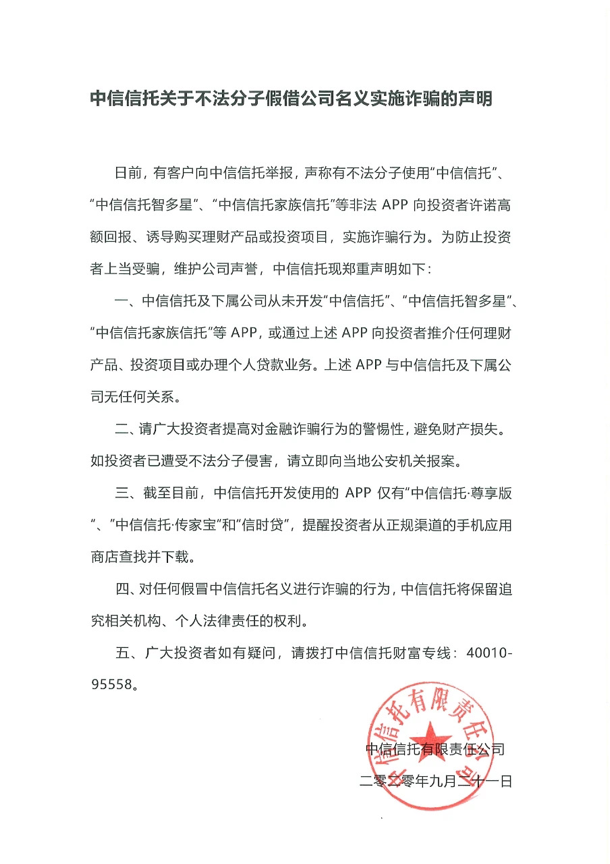 今年9月,中信信托声明称,日前,有客户向中信信托举报,声称有不法分子使用“中信信托”、“中信信托智多星”、“中信信托家族信托”等非法APP实施诈骗行为。