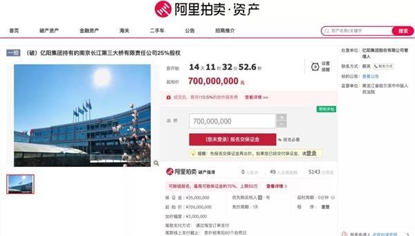 今年5月,哈尔滨市中级人民法院裁定批准亿阳集团的重整计划,亿阳集团开始变卖资产。就在10月20日,阿里拍卖网上挂出一单司法拍卖项目,亿阳集团将拍卖持有的南京长江第三大桥有限责任公司25%股权,起拍价7亿元。