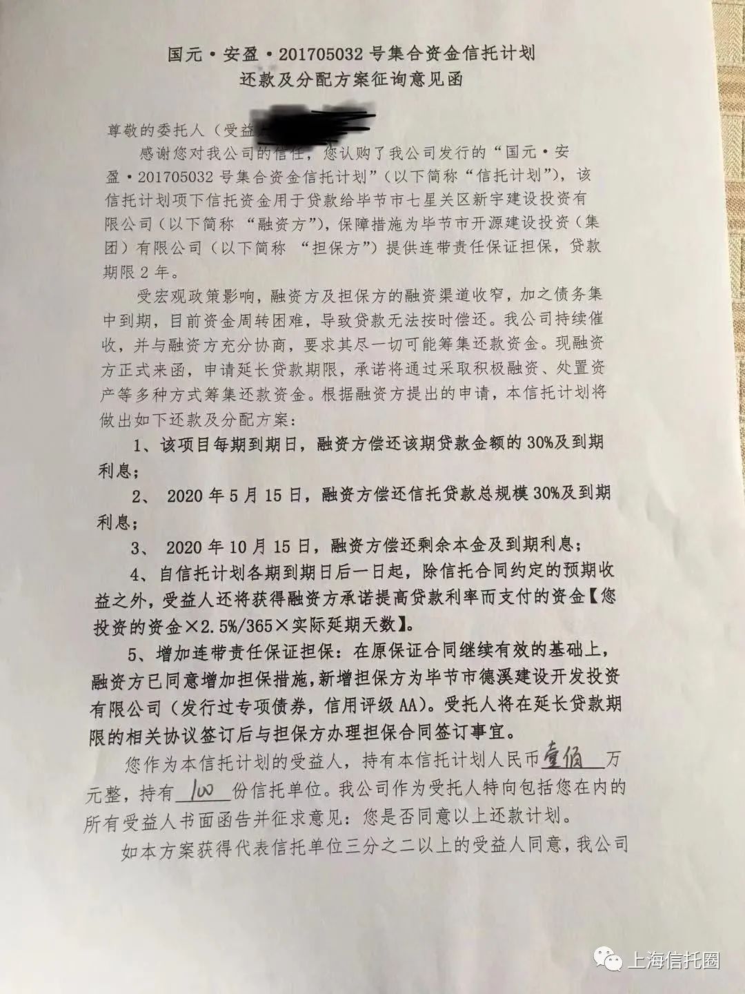 近日,国元信托安盈201705032号集合资金信托计划(以下简称“安盈201705032号”)投资者向财联社记者反映,按延期还款分配方案,本应于10月15日偿还的剩余本息未如期偿还,至今尚有40%款项未兑付。