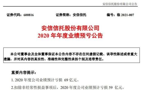 昨日晚间,安信信托发布公告称,该公司2020年业绩预亏,预计2020年度实现归属于上市公司股东的净利润为-69亿元,预计归属于上市公司股东扣除非经常性损益后的净利润为-59亿元。