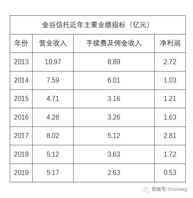 据2019年年报,截至2019年底,金谷信托管理信托资产规模约1003亿元,较2018年底(约1400亿元)缩水。