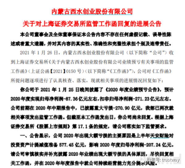 2月18日晚,西水股份发布公告,针对1月26日上交所关于西水股份2020年业绩大幅预亏相关事项的问询进行答复。