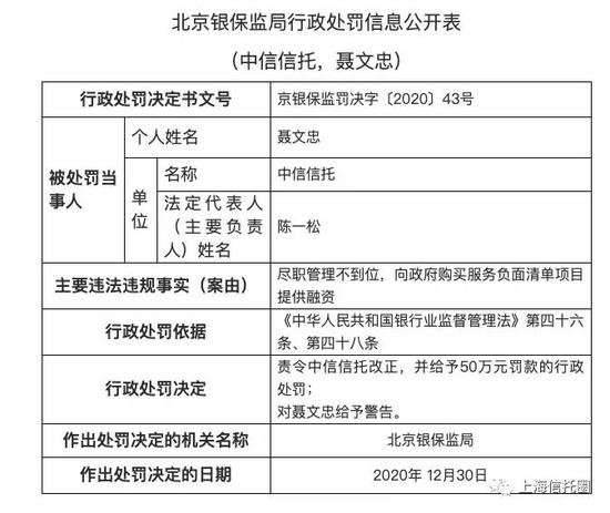 上海信托圈公号关注到,今年1月7号,北京银保监局发布对中信信托的罚单,而处罚原因却是:管理不到位,向政府购买服务负面清单项目提供融资。