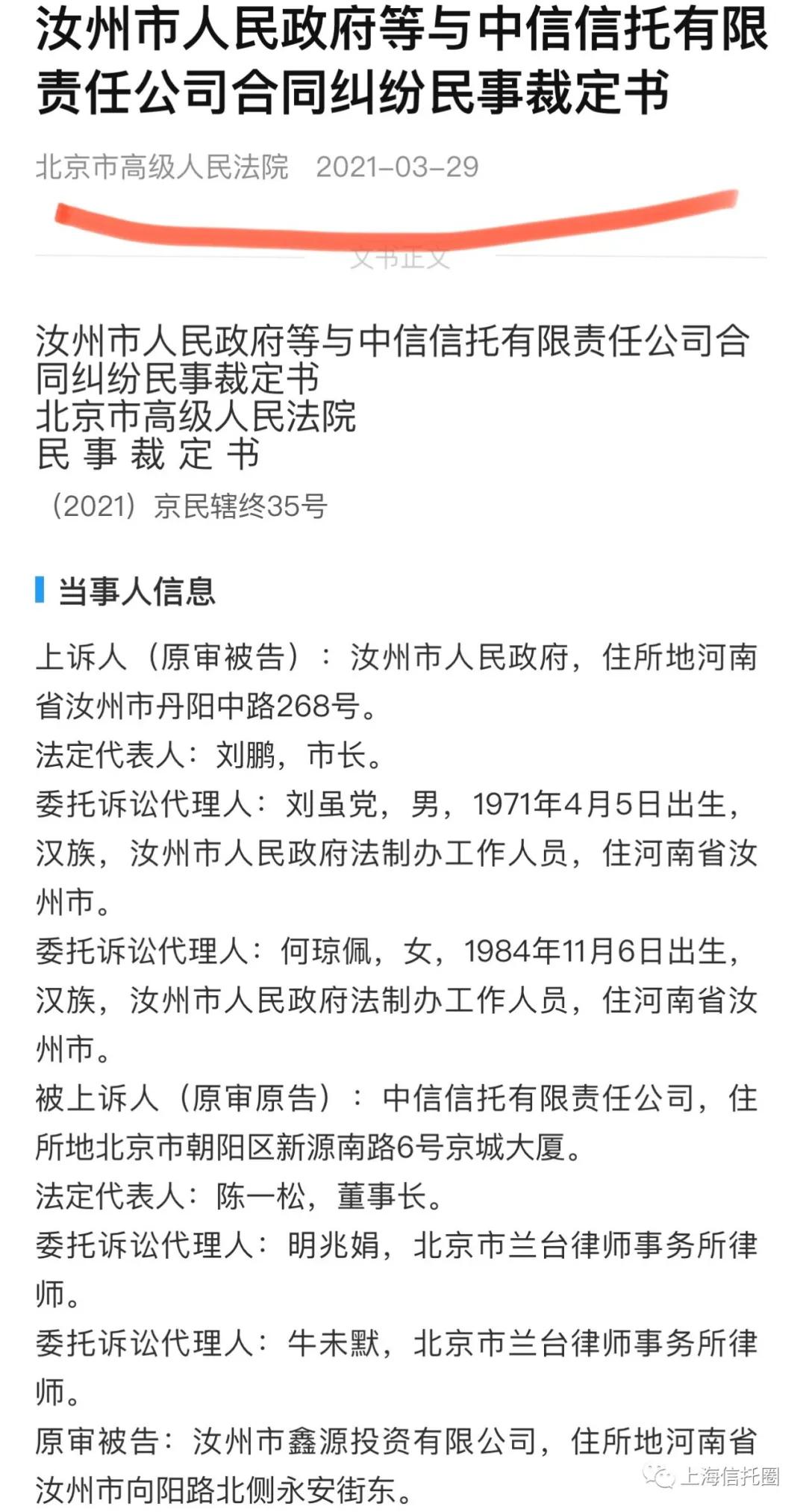 上海信托圈消息,3月29日,北京市高级人民法院披露了:汝州市人民政府等与中信信托合同纠纷民事裁定书。
