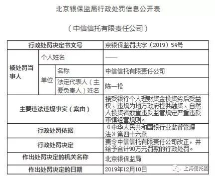 实际,中信信托因违规向地方政府提供融资被罚已不止一次了,2019年12月19日,北京银保监局对中信信托下发罚单,处罚内容中就包含:违规为地方政府提供融资。