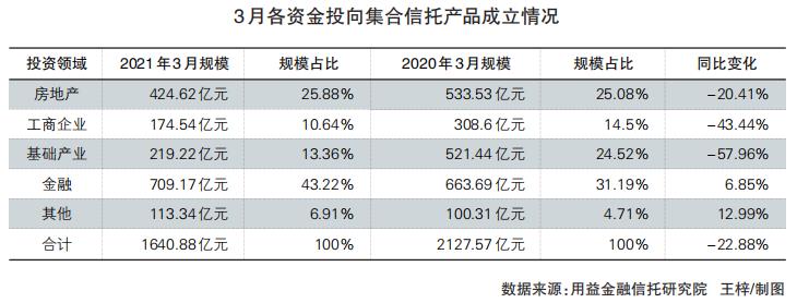 与地产业务相对的是3月金融类信托募集资金709.17亿元,环比增加120.26%,成为当月集合信托市场的最大增长点。