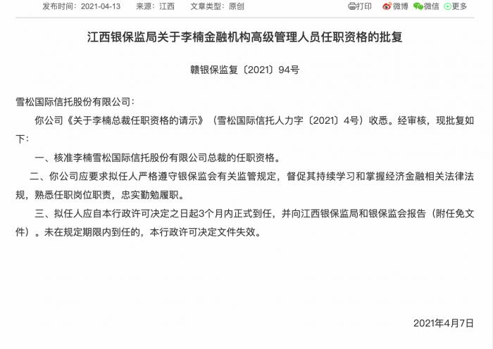 2021年4月13日,江西银保监局挂出一条批复,核准李楠担任雪松信托总裁一职,作出批复的时间为2021年4月7日。早在2021年4月9日,雪松信托官网便公告了上述批复信息。