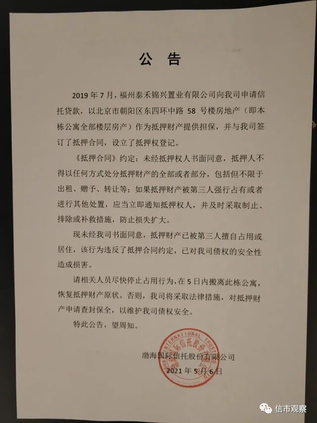 5月9日,泰禾集团收到了一封来自渤海国际信托有限公司的公告,渤海国际信托表明,泰禾集团总部北京公馆已经抵押给该信托,成了抵押物。