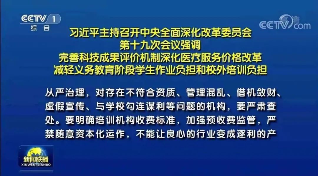 5月21日召开的中央全面深化改革委员会第十九次会议审议通过了《关于进一步减轻义务教育阶段学生作业负担和校外培训负担的意见》,提出要明确培训机构收费标准,加强预收费监管,严禁随意资本化运作,不能让良心的行业变成逐利的产业。