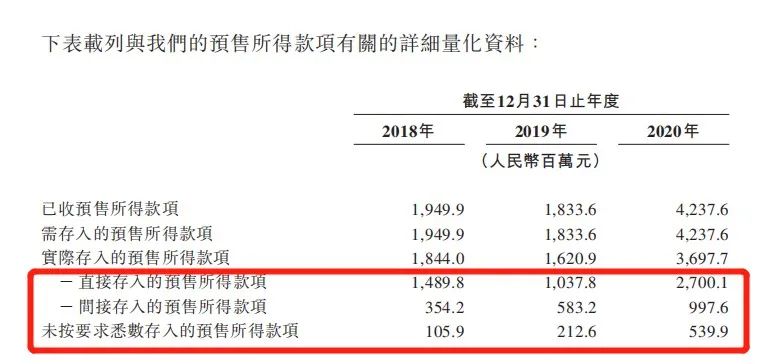 于2018年、2019年及2020年,未直接存入指定托管账户的预售所得款项分别约为人民币4.6亿元、7.96亿元及15.37亿元。其中,3.54亿元、5.83亿元及9.98亿元已存入一般公司账户,随后转入指定托管账户,分别占有关期间未直接存入指定托管账户金额的6.9%、73.3%及64.9%;未悉数存入指定托管账户的金额分别为人民币1.06亿元、人民币2.13亿元及人民币5.4亿元。