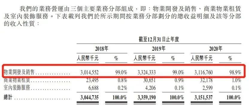 其中,房地产开发与销售的比重占绝对主导地位。据招股书,2018年、2019年与2020年,方直发展的收入分别为30.44亿元、33.59亿元和31.51亿元。其中,物业开发与销售业务收入分别为30.14亿元、33.24亿元和31.17亿元,占公司总收入的99%、99%和98.9%。