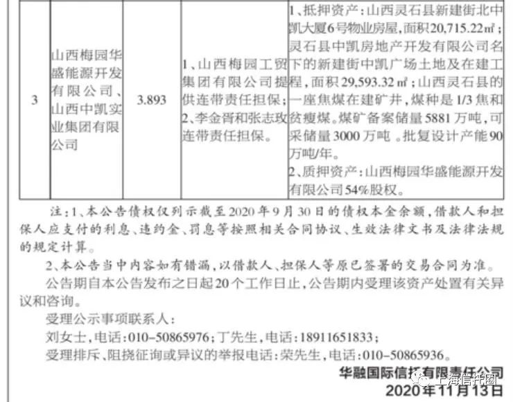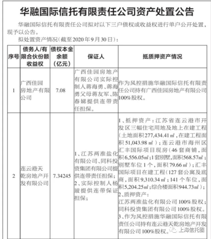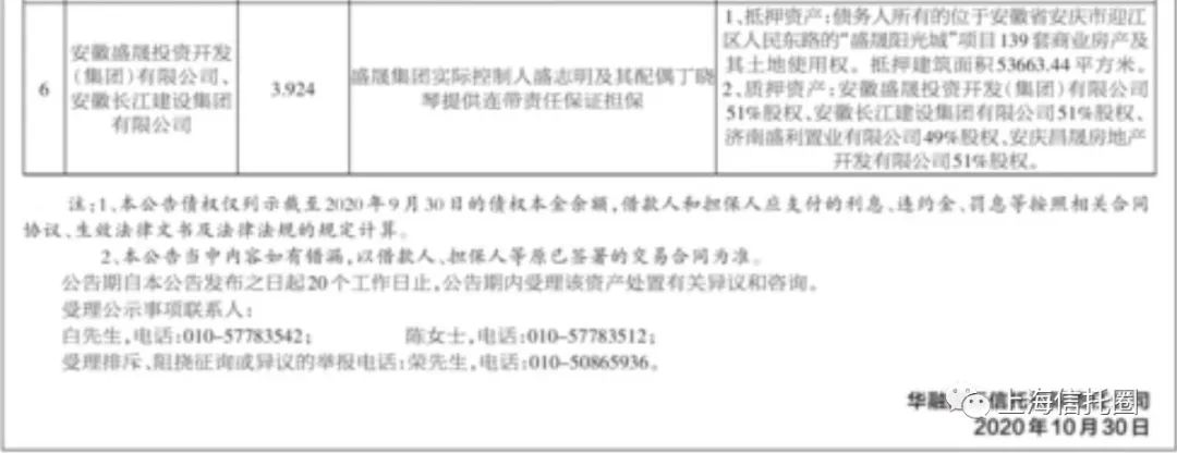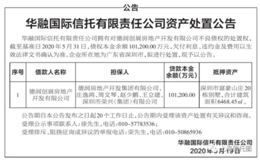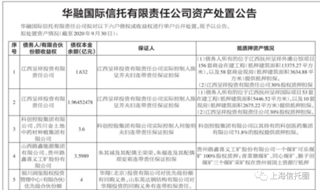 去年7月份,还发布了华融·富控并购贷款集合资金信托计划”资产处置项目转让信息,涉及金额约12亿元。
