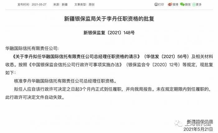 5月27日,新疆银保监局官网披露,核准李丹担任华融信托总经理一职,核准时间为2021年5月21日。