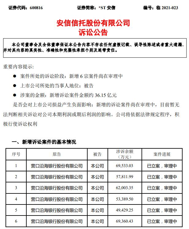 5月11日,安信信托披露一则诉讼公告,公司新增6宗案件,新增诉讼金额为36.15亿元,被告是安信信托,原告均是营口沿海银行。