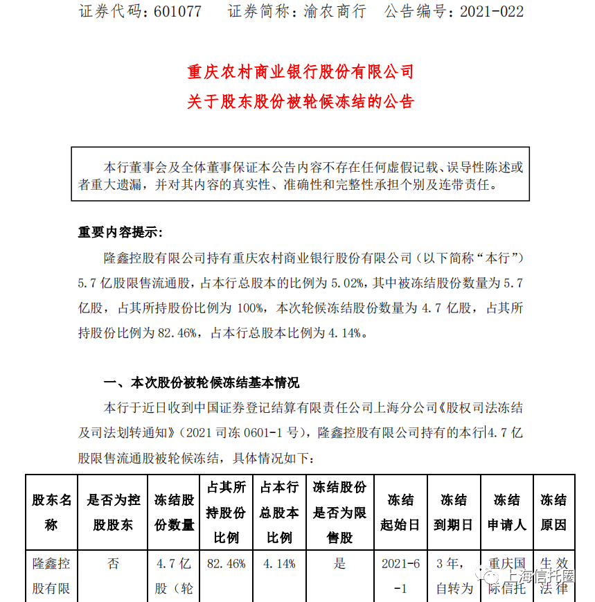 导读:6月3日,渝农商行公告,重庆国际信托申请轮候冻结隆鑫控股持有本行4.7亿股份,冻结期为自转为正式冻结之后的3年。目前,渝农商行股价在4.2元左右,本次重庆信托申请冻结4.7亿股,价值约19.74亿元。