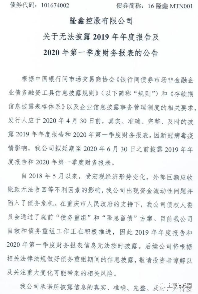隆鑫控股曾于2020年6月30日发布《关于无法披露2019年年度报告及2020年第一季度财务报表的公告》。公告称,自2018年5月以来,受宏观经济形势变化,外部巨额应收账款无法收回等不利因素的影响,隆鑫控股公司出现资金流动性问题并陷入了债务危机。