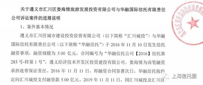 作为担保方的汇川区娄海情旅游发展公司表示,汇川城投正在就该事项与原告华融信托进行沟通协商。