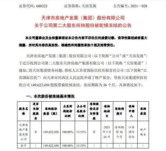 导读:近日,天房发展公告,公司第二大股东天房集团持有的公司1.496亿股股票被轮候冻结,冻结期限为36个月,冻结申请人为江苏国际信托。