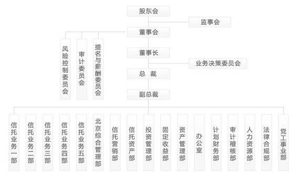 前台主要有业务部和财富中心。业务部门负责产品设计、运行,主要员工是项目经理(信托经理),主要对接融资方。财富中心负责信托产品销售,主要员工是销售经理,发行经理等,对接购买信托产品的投资人,一般都是自然人客户。中台主要有合规部和风控部。负责审批信托项目是否合规,以及控制风险,由法务人员组成。后台主要就是财务部、人力、办公室等职能部门。