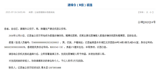 公安部公告称,2018年12月13日,江西省公安厅开始侦办裘强涉嫌洗钱、赌博犯罪案。该案主要犯罪嫌疑人裘强涉嫌洗钱罪和赌博罪,目前在逃。