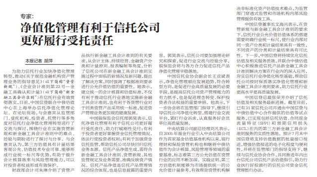 中国银保监会信托部郭昊表示,信托净值化管理有利于信托公司更好履行受托责任,助力打破刚性兑付;有利于投资者更好掌握资金信托管理情况,依法行使投资者权利;有利于加强资金信托监管,帮助信托公司尽快回归信托业务本源。信托产品净值生成,需符合新金融工具会计准则、资管新规、其他监管规定及业务需要,准确反映资产情况。信托产品净值是信托产品管理情况的综合体现,也是信息披露的重要内容。郭昊表示,信托公司要加强理论研究和探索,促进行业交流与经验分享,银保监会将与各方合力促进信托产品净值化管理平稳落地。