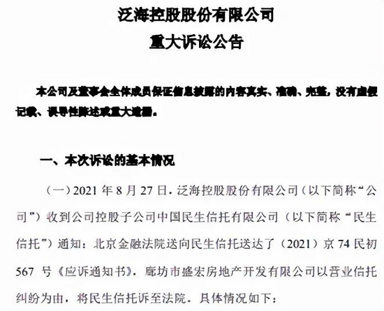 并且8月27日,泛海控股同样收到公司控股子公司民生信托通知:北京金融法院送向民生信托了(2021)京74民初567号《应诉通知书》和(2021)京74民初469号《应诉通知书》,廊坊市盛宏房地产开发有限公司和瑞昌龙福企业管理合伙企业(有限合伙)均以营业信托纠纷为由,将民生信托诉至法院。