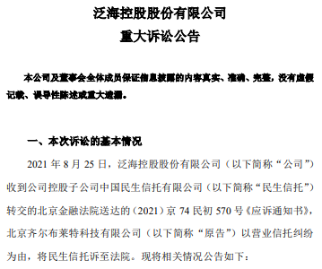 近日,泛海控股股份有限公司(以下简称“泛海控股”)发布重大诉讼公告。公告显示,8月25日,泛海控股收到公司控股子公司中国民生信托有限公司(以下简称“民生信托”)转交的北京金融法院送达的(2021)京74民初570号《应诉通知书》,北京齐尔布莱特科技有限公司(以下简称“原告”)以营业信托纠纷为由,将民生信托诉至法院。