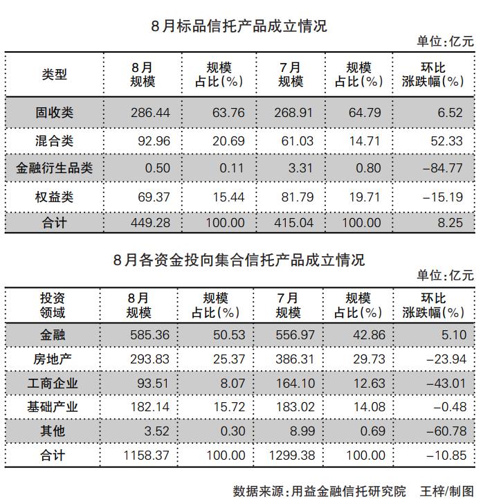 用益信托统计显示,8月金融类信托合计成立规模585.36亿元,与上月同时点相比增加5.10%。其中标品信托产品的成立规模449.28亿元,环比增长8.25%。其中,投向股票等权益类资产的集合信托产品的成立规模为69.37亿元,环比减少15.19%;投向债券等固收类资产的集合信托的成立规模286.44亿元,环比增加6.52%。