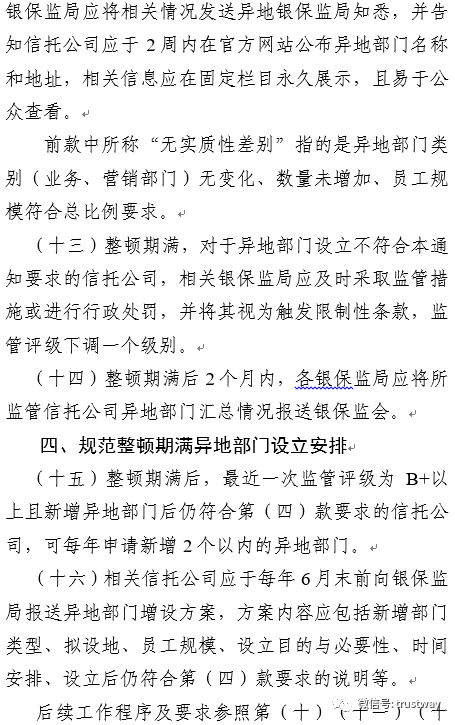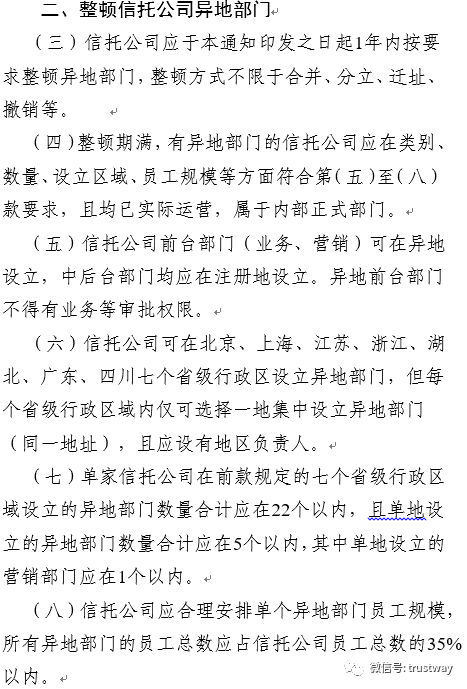 此次征求意见稿同样要求信托公司在一年之内整顿异地部门,整顿方式不限于合并、分立、迁址、撤销等。