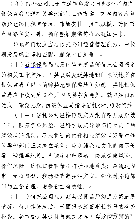 具体要求包括,信托公司前台部门(业务、营销)可在异地设立,中后台部门均应在注册地设立。异地前台部门不得有业务等审批权限;信托公司可在北京、上海、江苏、浙江、湖北、广东、四川七个省级行政区设立异地部门,但每个省级行政区域内仅可选择一地集中设立异地部门(同一地址),且应设有地区负责人;单家信托公司在前款规定的七个省级行政区域设立的异地部门数量合计应在22个以内,且单地设立的异地部门数量合计应在5个以内,其中单地设立的营销部门应在1个以内;信托公司应合理安排单个异地部门员工规模,所有异地部门的员工总数应占信托公司员工总数的35%以内。