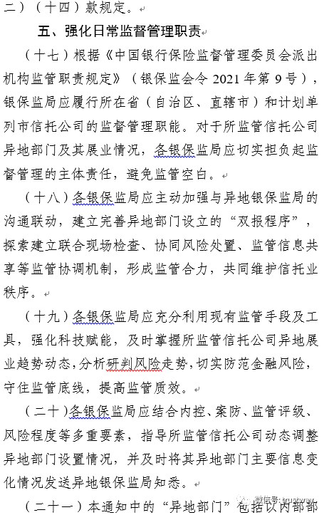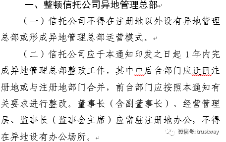 上述征求意见稿明确要求信托公司在一年之内完成对异地管理总部的整顿,要点包括中后台部门迁回注册地或与注册地部门合并,所有异地部门的员工总数应占信托公司员工总数的35%以内等等。征求意见稿还提到,董事长(含副董事长)、经营管理层、监事长(监事会主席)应常驻注册地办公,不得在异地设有办公场所。