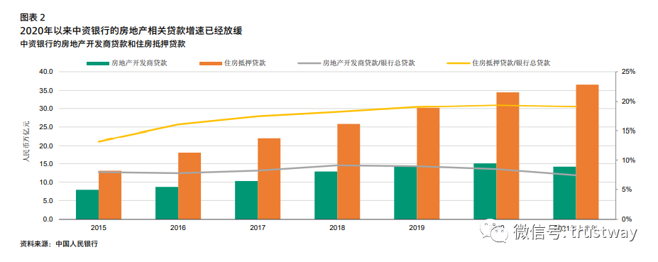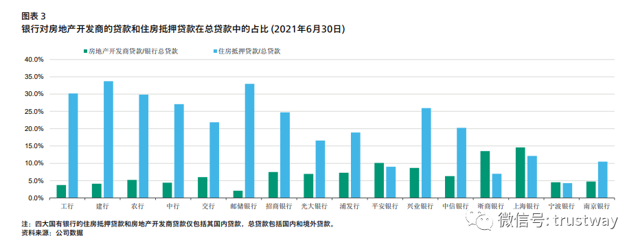 穆迪表示,截至2021年6月底,中资银行对房地产开发商的总贷款和住房抵押贷款分别为人民币14.2万亿元和人民币36.6万亿元,占全行业贷款总额的7.4%和19.1%。股份制商业银行对房地产开发商的敞口高于国有银行。