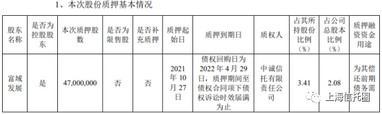 新城控股(证券代码:601155)控股股东富域发展集团有限公司向中诚信托有限责任公司质押股份4700万股,用于为其偿还前期债务需要。