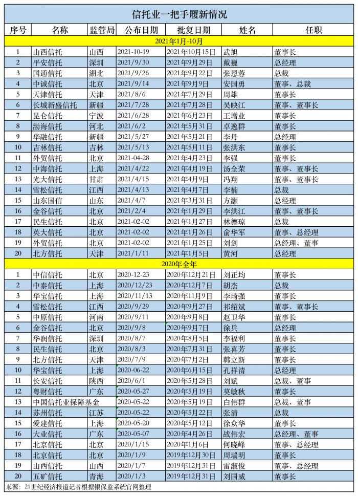 总计有20位一把手履新,与2020年全年数量(含中国信托业保障基金)持平。
