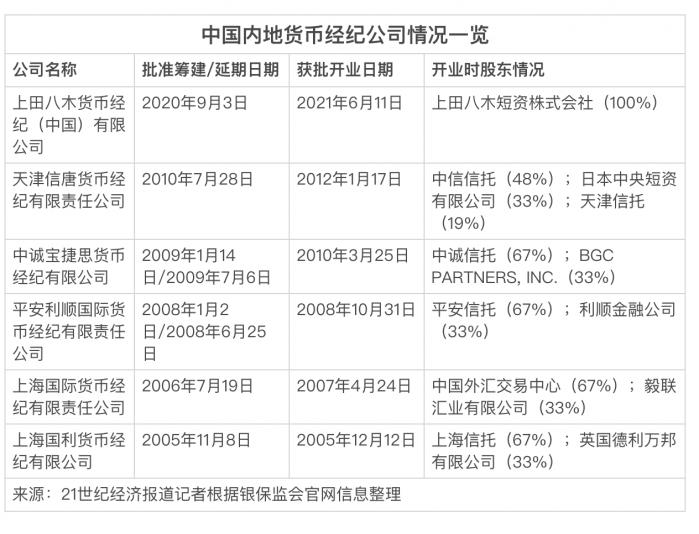 2020年9月3日,内地迎来了第6家获批筹建的货币经纪公司,也是首家独资货币经纪公司——上田八木货币经纪(中国)有限公司。该公司于2021年6月获批开业,注册资本为6000万元,由上田八木短资株式会社100%出资。