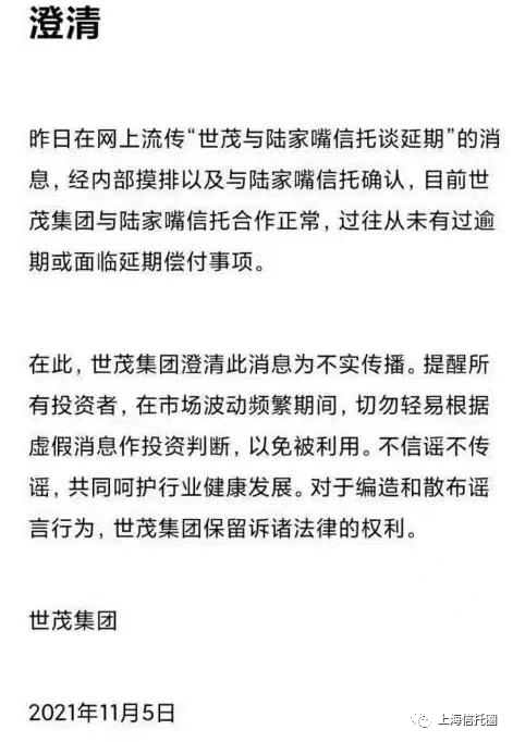 上海信托圈公号关注到,11月5日,世茂集团发布澄清声明,昨日在网上流传“世茂与陆家嘴信托谈延期”的消息,经内部摸排以及与陆家嘴信托确认,目前世茂集团与陆家嘴信托合作正常,过往从未有过逾期或面临延期偿付事项。