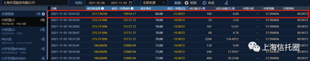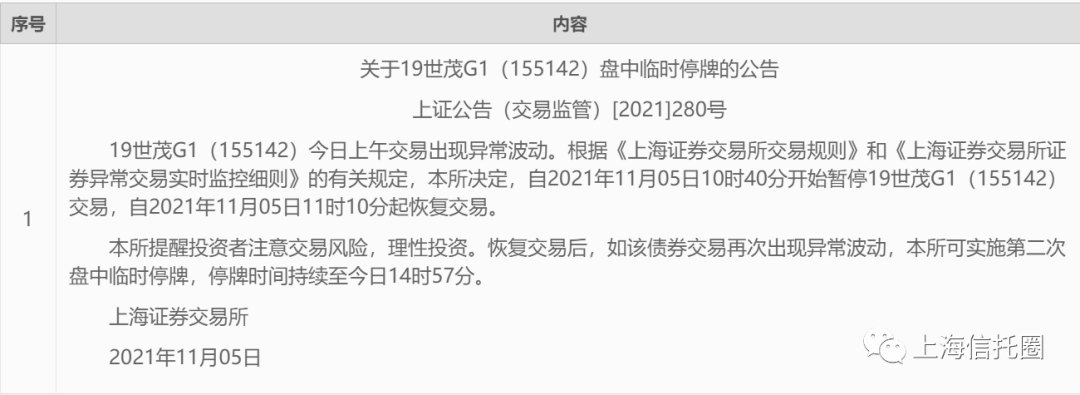 11月5日,上交所公告,“19世茂G1”今日上午交易出现异常波动。根据有关规定,本所决定,自2021年11月05日10时40分开始暂停“19世茂G1”交易,自2021年11月05日11时10分起恢复交易。成交净价66元。