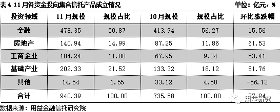 统计数据显示,11月集合信托市场投向房地产、基础产业和工商企业三大领域的产品成立规模环比增长率均超过50%,房地产领域更是环比增长61.53%;投向金融领域的产品成立规模环比增幅相对较小,仅为15.56%。