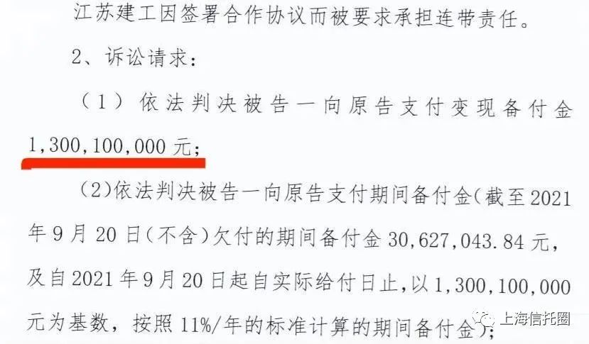 中诚信托要求判决江苏省建工集团控股支付变现备付金13亿元及违约金,同时要求江苏建工集团对上述债务承担连带责任等。